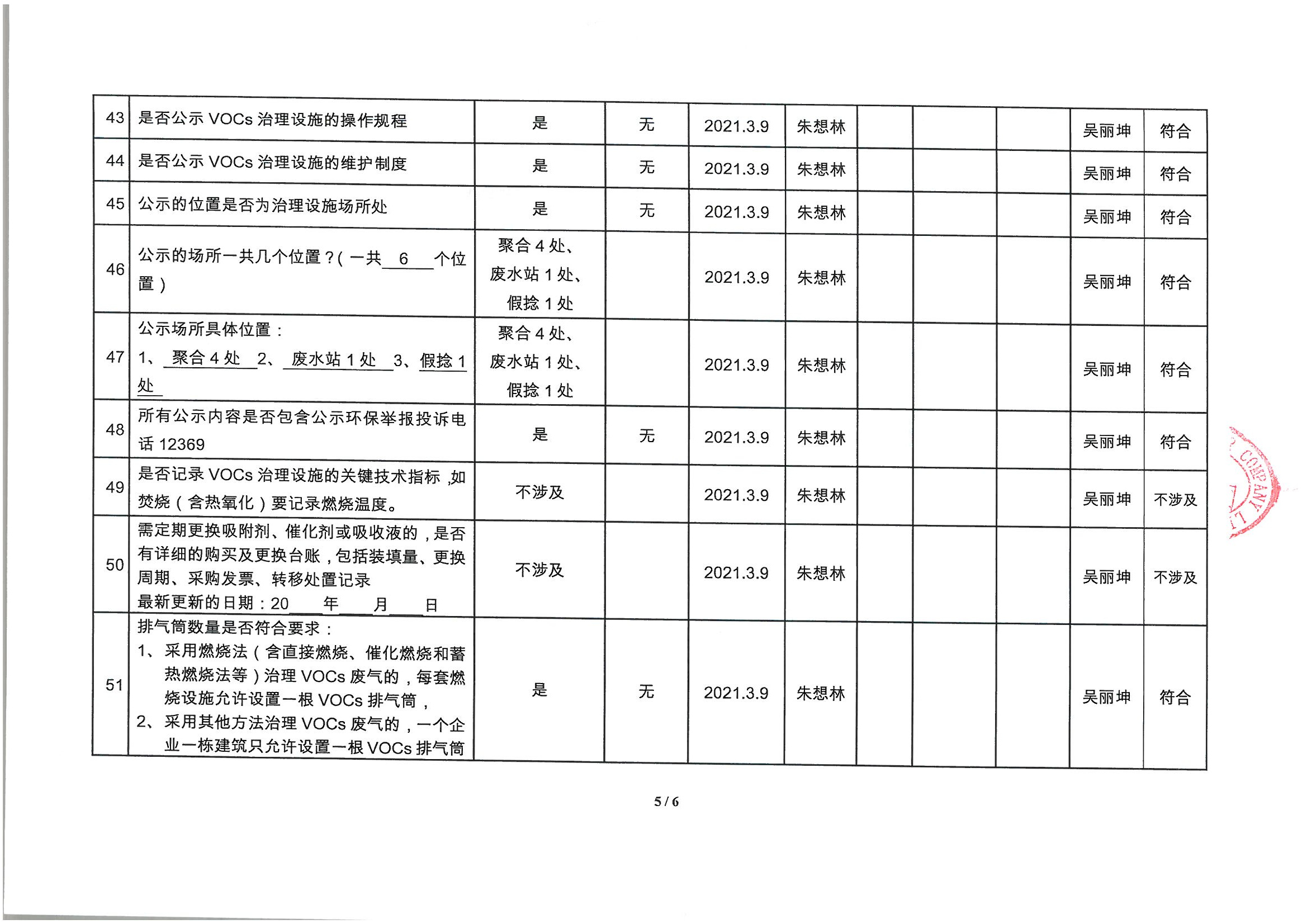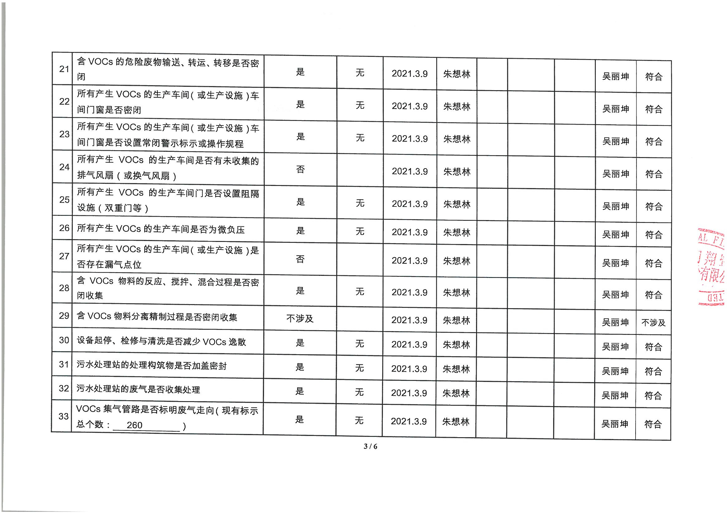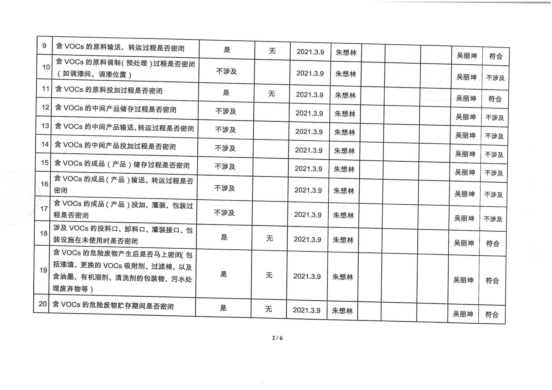 廈門市揮發性有機物污染防治企業自查表 (2021年 第一季度)